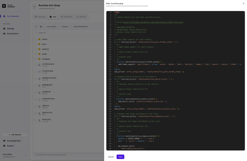 Due to the dockerized nature of WordPress sites on FluxRunner, the files are not directly accessible via FTP. We are working on extending the file editing capabilities via FTP.
